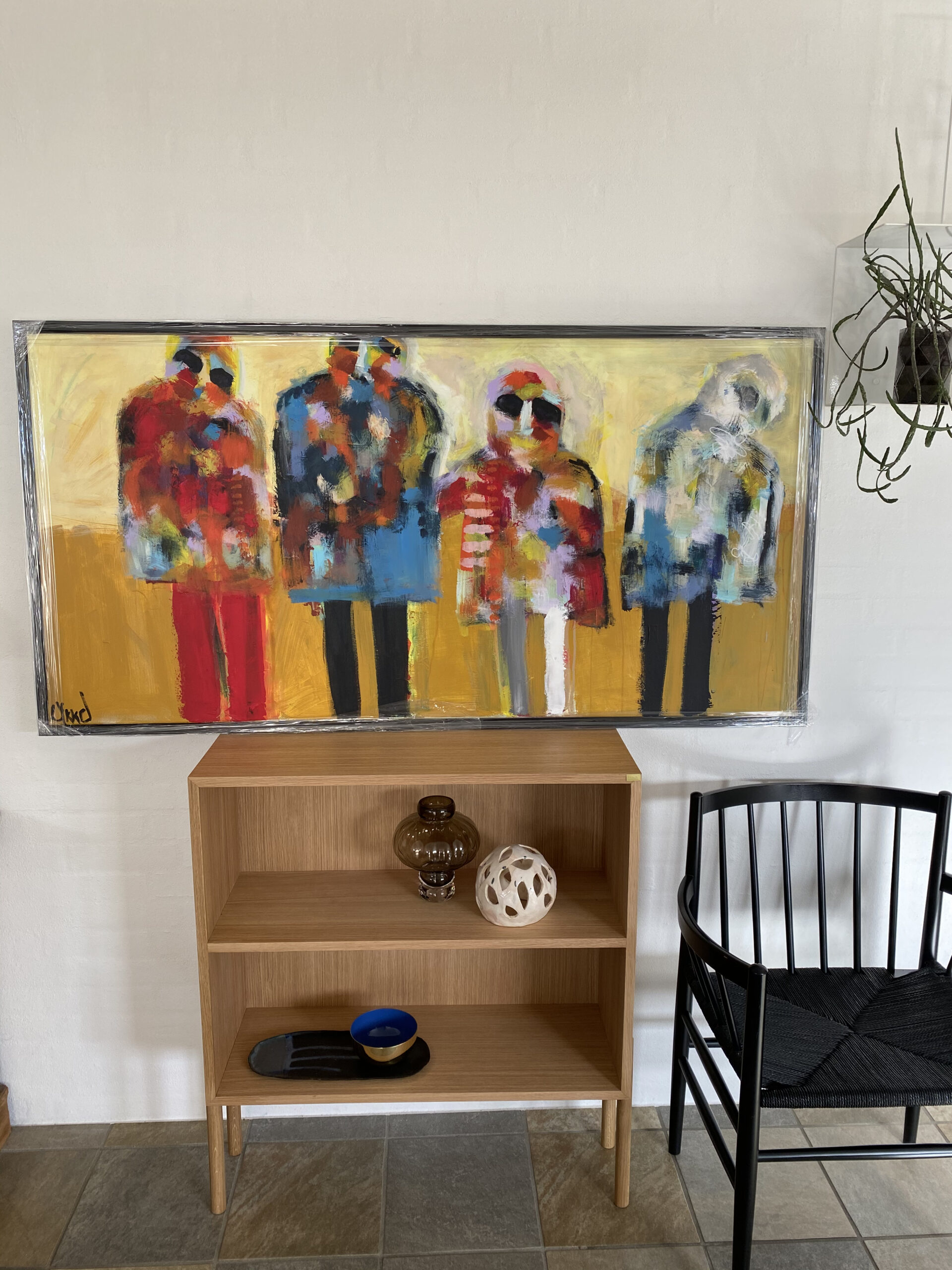 Skøn farverig harmonisk maleri. Man kan næsten se, at familiens teenager ikke gider at gå med på gåtur på stranden.